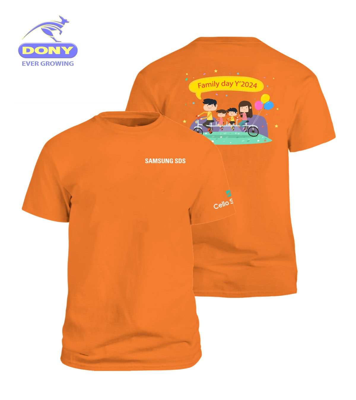 Thiết kế áo tay ngắn, cổ tròn trẻ trung, dễ phối hợp với quần jeans, kaki hoặc quần short. Logo Samsung SDS được in gọn gàng trước ngực trái và trên tay áo, trong khi lưng áo nổi bật với hình in hoạt họa đầy màu sắc kèm dòng chữ “Family Day Y’2024”, tạo nên sự vui nhộn, gắn kết tập thể.