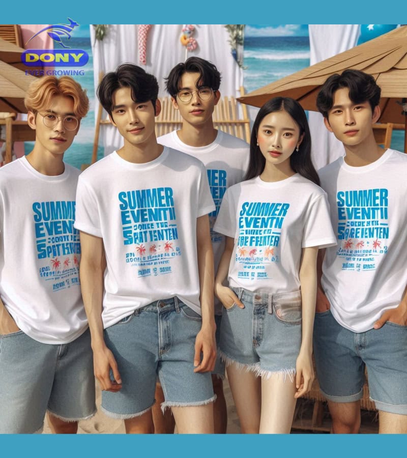 - Họa tiết chữ “SUMMER EVENT” in màu xanh dương làm điểm nhấn, gợi tinh thần sôi động của mùa hè và sự gắn kết tập thể.