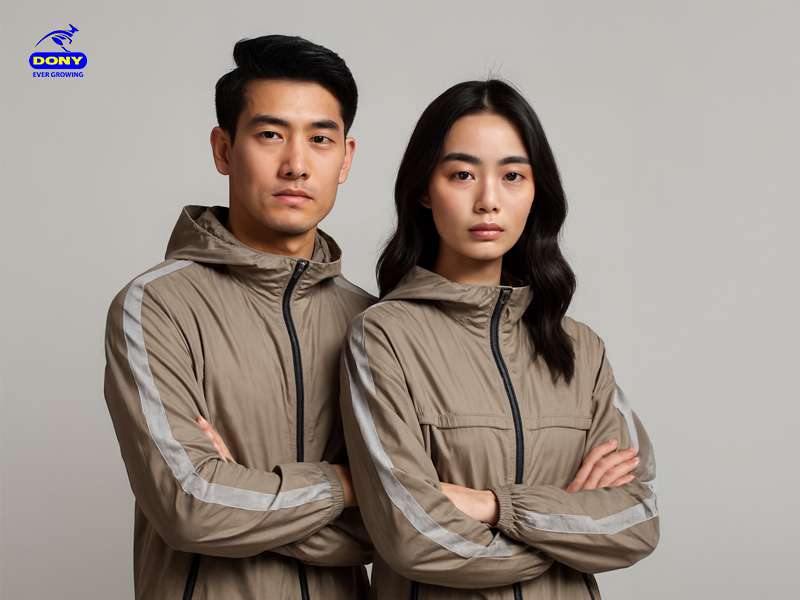 Màu nâu be trung tính – sang, sạch, dễ phối logo thương hiệu. Dải phản quang màu bạc nổi bật chạy dọc tay áo giúp tăng khả năng nhận diện trong điều kiện thiếu sáng.
