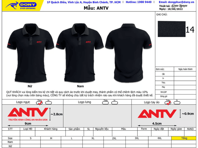Logo ANTV thêu tại 2 vị trí: ngực trái – tay áo phải, kích thước thêu được tính toán hợp lý nhằm đảm bảo hiệu quả nhận diện mà không gây rối mắt.