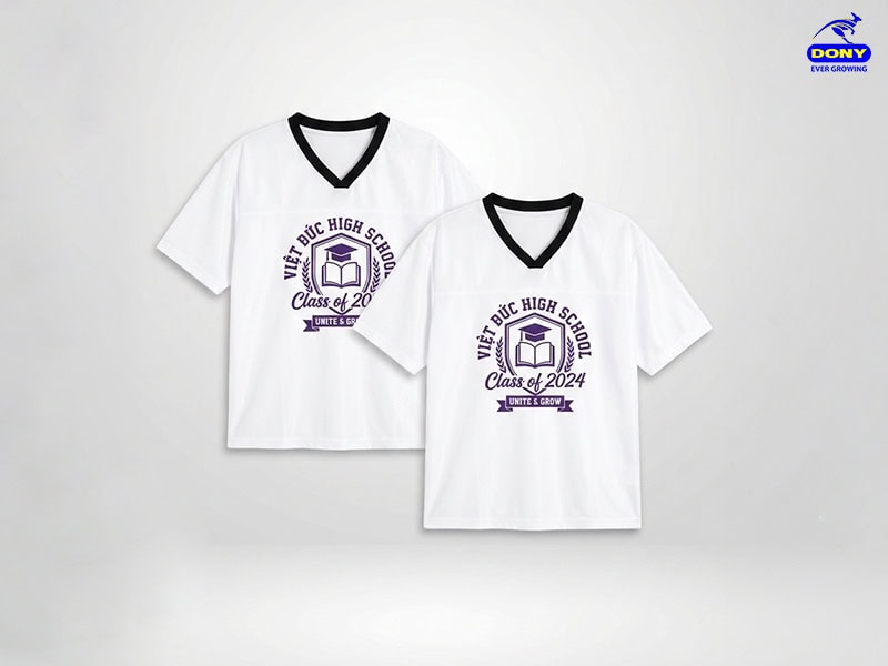 Mẫu áo sở hữu thiết kế freesize rộng rãi, mang phong cách trẻ trung và năng động. Điểm nhấn nổi bật là hình in logo “Việt Đức High School – Class of 2024” ở trung tâm ngực, kết hợp biểu tượng học thuật như sách và mũ tốt nghiệp. Tổng thể thiết kế vừa thể hiện tinh thần đoàn kết của tập thể lớp, vừa tạo nên phong cách cá tính và dễ nhận diện.
