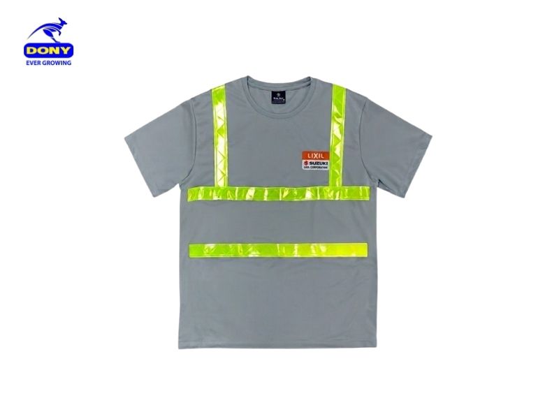 Tông màu xám trung tính chủ đạo, mang lại cảm giác sạch sẽ, hiện đại và ít bám bẩn. Kết hợp cùng dải phản quang vàng chanh nổi bật, tạo hiệu ứng thị giác mạnh mẽ. DONY hỗ trợ may mẫu áo thun đồng phục này với đa dạng màu sắc.