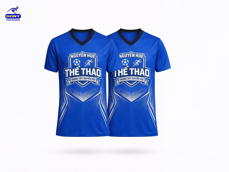 Áo sử dụng gam màu xanh thể thao nổi bật, mang lại cảm giác tươi mới và tràn đầy năng lượng. Màu sắc được phối hài hòa với họa tiết trắng giúp logo và hình in nổi bật hơn, tạo tổng thể bắt mắt nhưng vẫn giữ được sự gọn gàng và phù hợp với môi trường học đường.