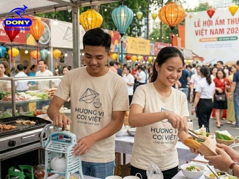 Mẫu áo thun sự kiện ẩm thực kết hợp hoàn hảo giữa nét đẹp văn hóa truyền thống và phong cách thời trang tối giản. Sản phẩm không chỉ là trang phục mà còn là lời chào nồng hậu gửi đến khách tham quan.