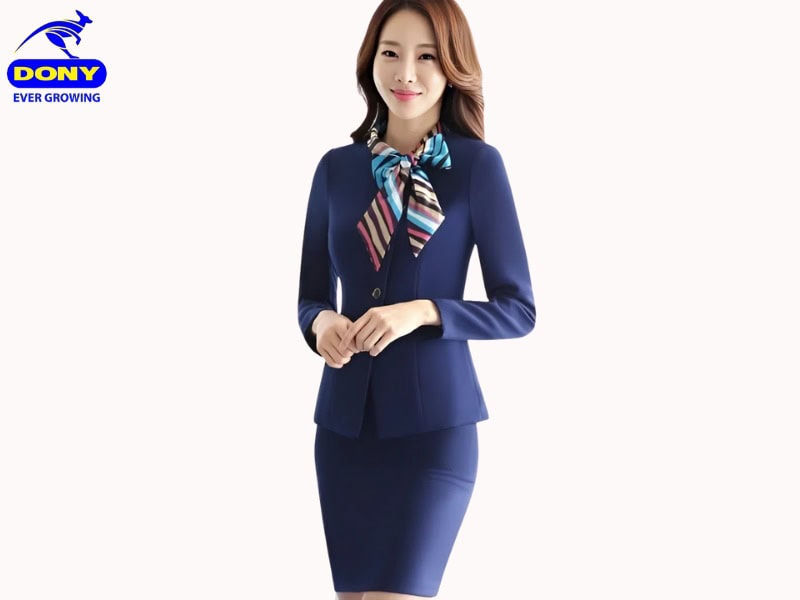 Màu xanh navy chủ đạo toát lên vẻ chuyên nghiệp, hiện đại và tin cậy cho khách sạn, spa và văn phòng hành chính. Gam màu này còn giúp tôn da và mang lại cảm giác trang nhã, dễ phối cùng các phụ kiện như giày cao gót hoặc khăn cổ.