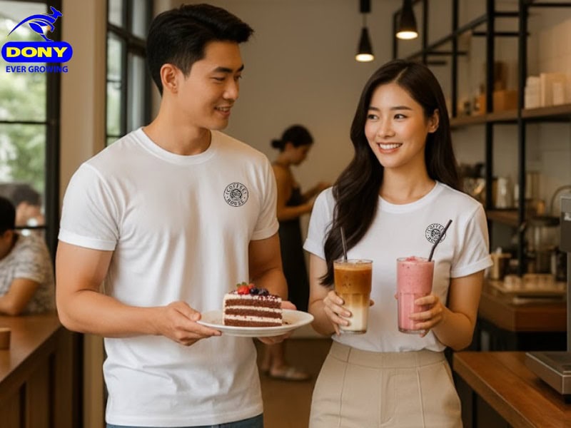 Mẫu đồng phục quán cafe 14 là sản phẩm mang tinh thần hiện đại, được DONY thiết kế dành riêng cho các thương hiệu trong lĩnh vực F&B. Áo thun cổ tròn màu trắng không chỉ mang lại sự thoải mái cho nhân viên mà còn góp phần xây dựng hình ảnh thương hiệu năng động trong mắt khách hàng.