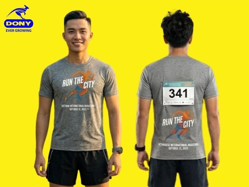 Áo thun sự kiện Marathon mang phong cách trẻ trung, khỏe khoắn. Trang phục giúp người mặc thoải mái vận động và đồng thời tạo dấu ấn nhận diện cho chương trình.
