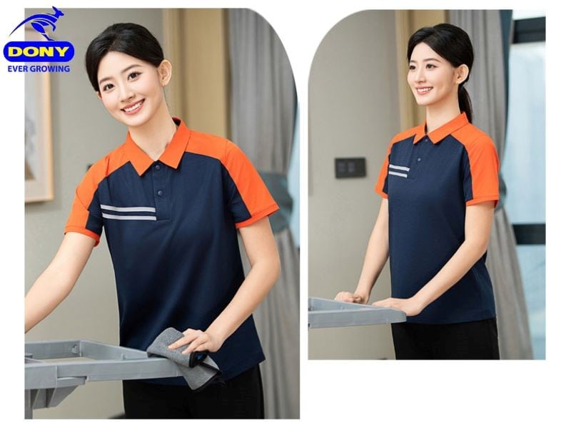 Trong môi trường khách sạn – nơi yêu cầu cao về hình ảnh chuyên nghiệp và trải nghiệm dịch vụ, đồng phục không chỉ là trang phục làm việc mà còn là yếu tố nhận diện thương hiệu. Mẫu áo thun polo màu cam phối xanh mang đến tổng thể nổi bật, năng động nhưng vẫn giữ được sự chỉn chu.