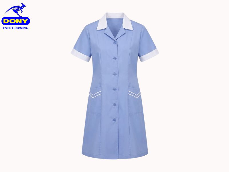 Màu xanh pastel chủ đạo mang lại cảm giác sạch sẽ, nhẹ nhàng. Phần viền trắng ở cổ và tay áo tạo điểm nhấn tinh tế, giúp tổng thể trang phục nổi bật hơn. DONY nhận may nhiều màu sắc cho thiết kế này.