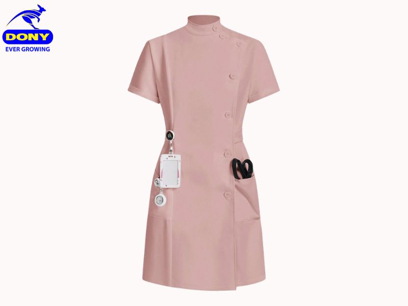 Váy đồng phục điều dưỡng màu hồng được thiết kế theo phong cách tối giản nhưng tinh tế, sử dụng form dáng chữ A hiện đại, giúp tôn dáng và tạo sự linh hoạt khi di chuyển. Tông màu hồng pastel nhẹ nhàng kết hợp cùng chi tiết nút lệch và cổ cao kín đáo mang đến tổng thể hài hòa giữa thẩm mỹ và tính chuyên môn trong môi trường y tế.